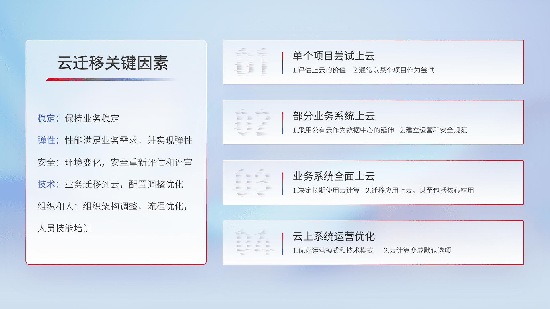结合实际业务,,,从规划设计、、、、云平台选型、、、云原生改造、、数据迁移、、、、集成交付,,,迁移全过程为客户识别最佳上云路径,,,做好风险识别管理,,设计网络架构、、身份权限、、、、安全审计合规、、操作审计、、、、日志审计、、、监控告警策略、、、多站点容灾设计等,,,对云上基础设施进行整体规划,,,提升IT治理水平,,以满足弹性、、、、高可用、、、高性能的需求。。